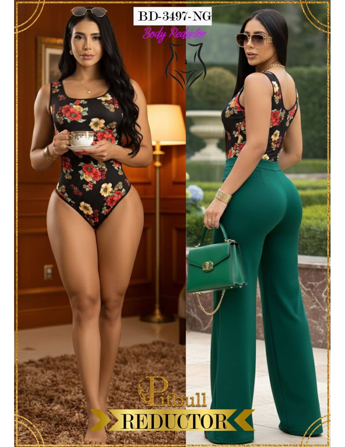 El Body Reductor Pitbull BD-3497-NG es la prenda ideal para quienes buscan moldeo y diseño sofisticado. Su estampado floral en fondo negro aporta un aire elegante y moderno, mientras que su faja integrada brinda control en la zona del abdomen y cintura.
