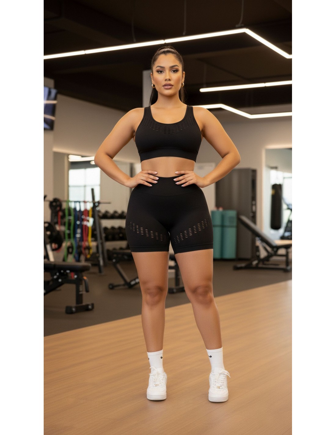 El top deportivo cuenta con perforaciones estratégicas para una mejor ventilación y ajuste ergonómico en el busto. Su diseño de espalda cerrada brinda seguridad, mientras que el short con realce de glúteo ultra invisible estiliza tu silueta de manera natural gracias a su confección en tejido inteligente.